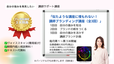 本講座〈ベーシックコース〉は、そんな課題を持つ方のために設計された 全3回完結の短期集中型プログラム です。単なる知識の習得ではなく、ワークやヴォイススキャンを通じて「あなた自身の講師ブランド」を一緒に作り上げていきます。講師としての基盤を固め、活動の第一歩を安心して踏み出すための伴走型講座です。