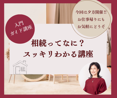 「相続のモヤモヤ、今からスッキリ、安心の一歩」相続が初めての方でも安心して学べる講座です。相続に関する基礎から実際の手続きまで分かりやすく解説します。「今から準備する大切さ」を実感し、不安を解消してスッキリしましょう!