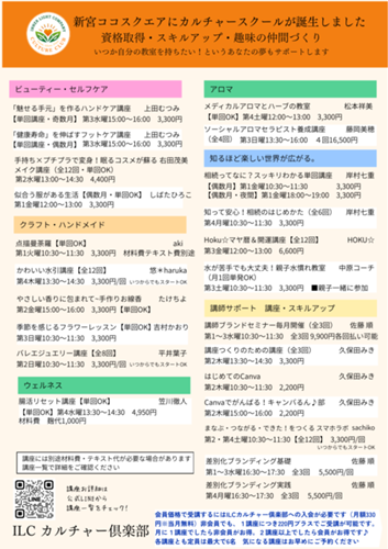 講座つくりを学びたいあなたへ ※ILCカルチャー俱楽部の講師を希望するかたに限ります 次回の募集は10月期 開催日 10/9・11/13・12/11 あなたの経験が宝物!目指せ、講師デビュー 月イチ講座全3回 3ヶ月サポートします! 各回先着6名限定 第2木曜日13:30~14:30開催 受講料 会員価格3,300円(税込)/月※カルチャー倶楽部会費月300円ですべての講座が会員価格で受講可能 非...